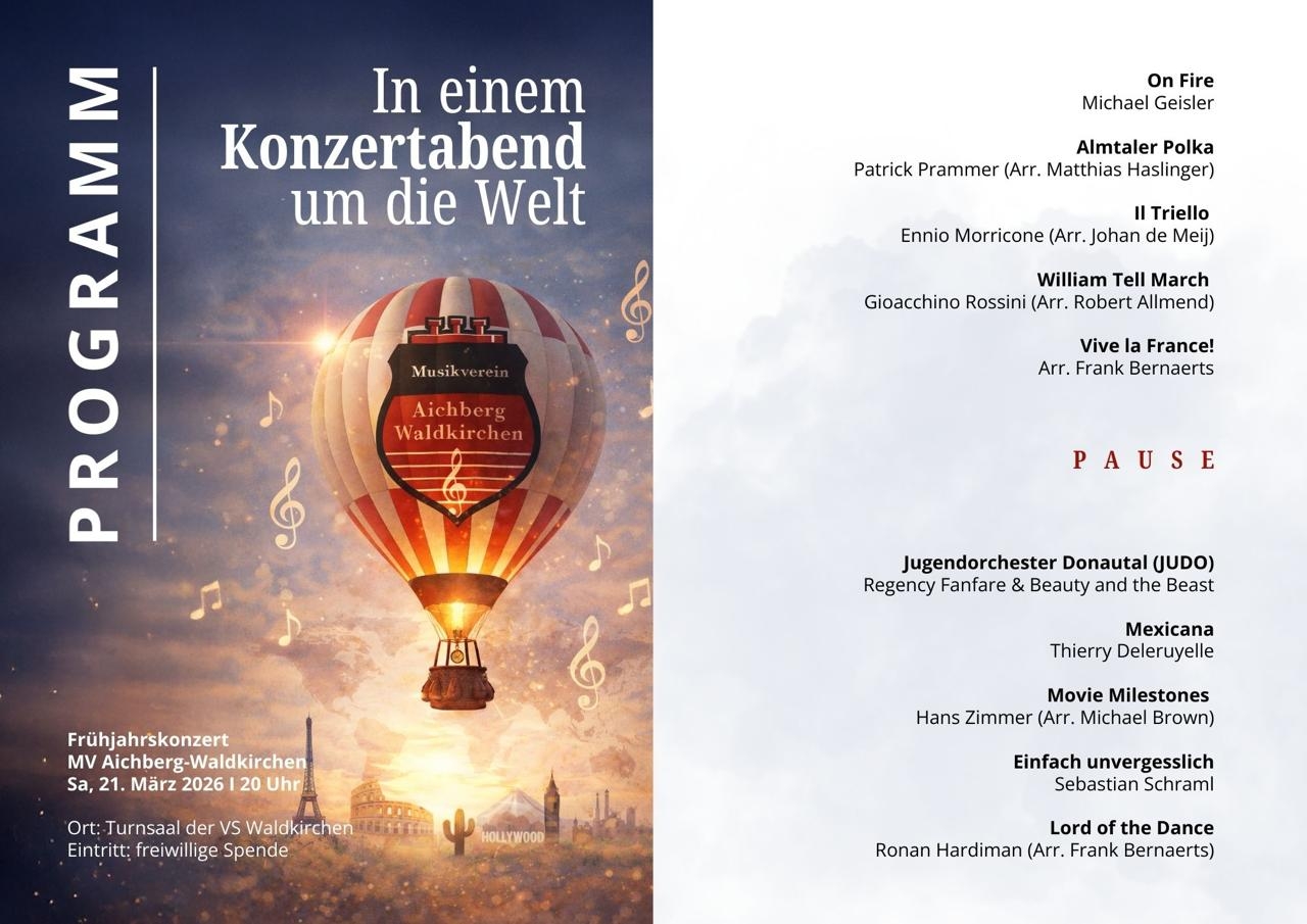 Wir nehmen euch mit auf eine musikalische Reise von Europa bis Hollywood - mit bekannten Melodien, mitreißenden Rhythmen und ganz viel Herzblut. Wir freuen uns, dass Julia Siegel die musikalische Leitung für unser diesjähriges Frühjahrskonzert übernimmt. Sie hat sich ein abwechlungsreiches Programm überlegt. So werden Stücke wie Wilhelm Tell Marsch, Viva La France, Movie Milestones oder Lord of the Dance zum Besten gegeben. Außerdem wird auch wieder unser Jugendorchester Donautal (JUDO) zwei Stücke präsentieren.