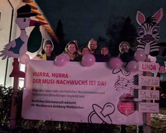 Wir gratulieren unserer Flügelhornistin Teresa Aichinger und ihrem Raphael, seinerseits Kapellmeister vom Musikverein Hartkirchen, ganz herzlich zur Geburt der kleinen Linda. Sie kam am 20. Februar um 06.20 Uhr mit 51 cm und 3600 g zur Welt. Gemeinsam mit den jungen Eltern freut sich auch der große Bruder Felix über eine baldige Spielgefährtin! :)